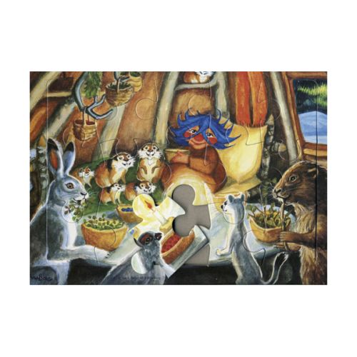 Rammepuslespil i træ. 15 brikker. Illustreret af Inga Borgs.