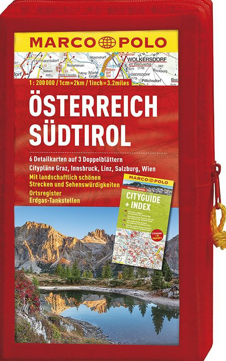 Praktisk kortsæt i nylonomslag med pratisk lynlås. Sættet består af 3 kort i målestokken 1:200.000 og et register på 130 sider med bynavne samt 5 bykort over Graz, Innsbruck, Linz, Salzburg og Wien . Kortene har mange praktiske detaljer.